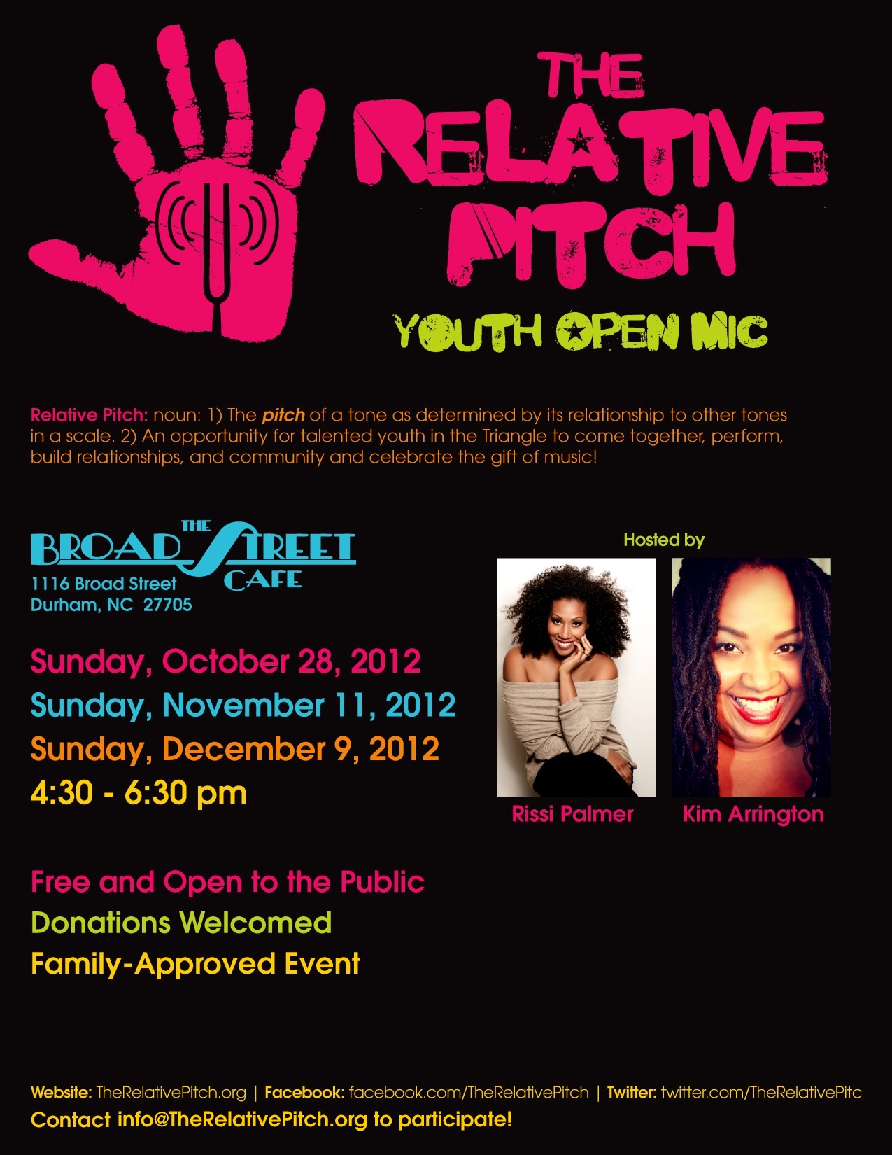 DURHAM, NC – Triangle-based singers Rissi Palmer and Kim Arrington have started The Relative Pitch, a monthy open mic for youth. The opening night for The Relative Pitch is Sunday, October 28 at The Broad Street Café in Durham, NC (1116 Broad Street, Durham, NC 27705) at 4:30 pm – 6:30 pm. The event is free and open to the public. Donations are welcomed.