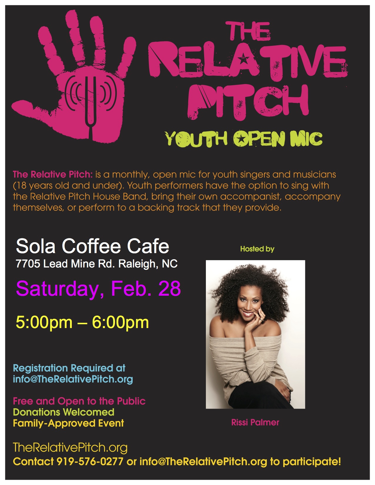 Rissi: I got the idea to start The Relative Pitch early this summer. I started working with some young singers through The Grace Note and was looking for places for them to sing outside of the annual recital. I realized that there wasn’t anything that was free or wasn’t competition based. I decided to contact my friend Kim, who is a seasoned and well known artist here in the Triangle who has a background working with kids, and see if she was interested. We both immediately thought of the Broad Street Café as the perfect venue because of its family friendly atmosphere as well as the great stage.